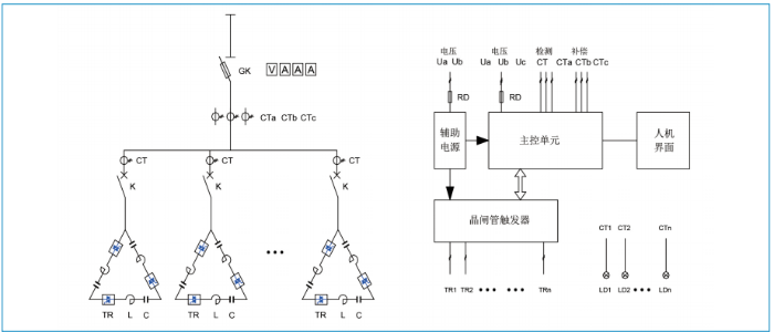 華天HTEQ系列動態消諧無功補償裝置由檢測單元、主控單元、投切執行單元和調諧電容器組(含電抗器)及人機界面等部分構成。檢測單元通過電壓、電流傳感器實時檢測系統電壓和電流的瞬時值,并實時計算出系統所需無功功率、諧波成分、電壓電流有效值等參量,由主控單元完成邏輯判斷并發出相應的控制指令,控制投切執行單元投切調諧電容器組,實現對負載無功功率的動態跟蹤補償。